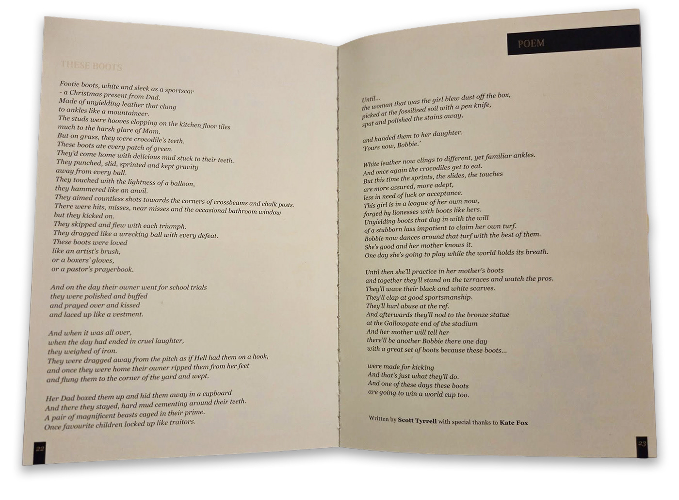 In 2023 I was asked to pen another football poem for the event, to be performed by the great North East actress Charlie Hardwick (Billy Elliot, Our Friends in the North, Emmerdale). The poem was written with the recent wins by the Lionesses in mind. Massive thanks to fellow poet Kate Fox for her perspective.