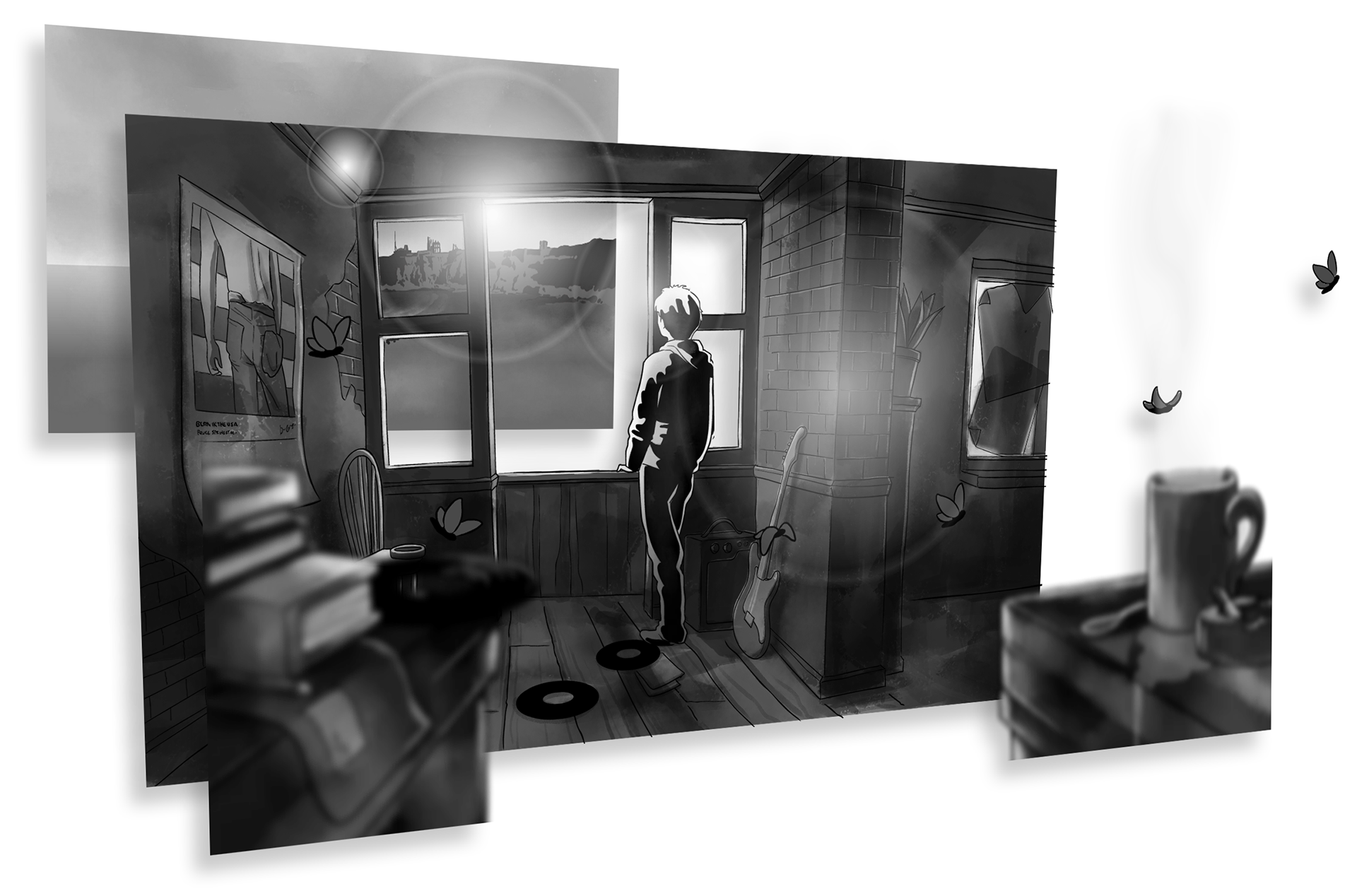 I designed the room the boy would inhabit to be a slightly run down flat (maybe a squat) but peppered with records notes and musical influences.