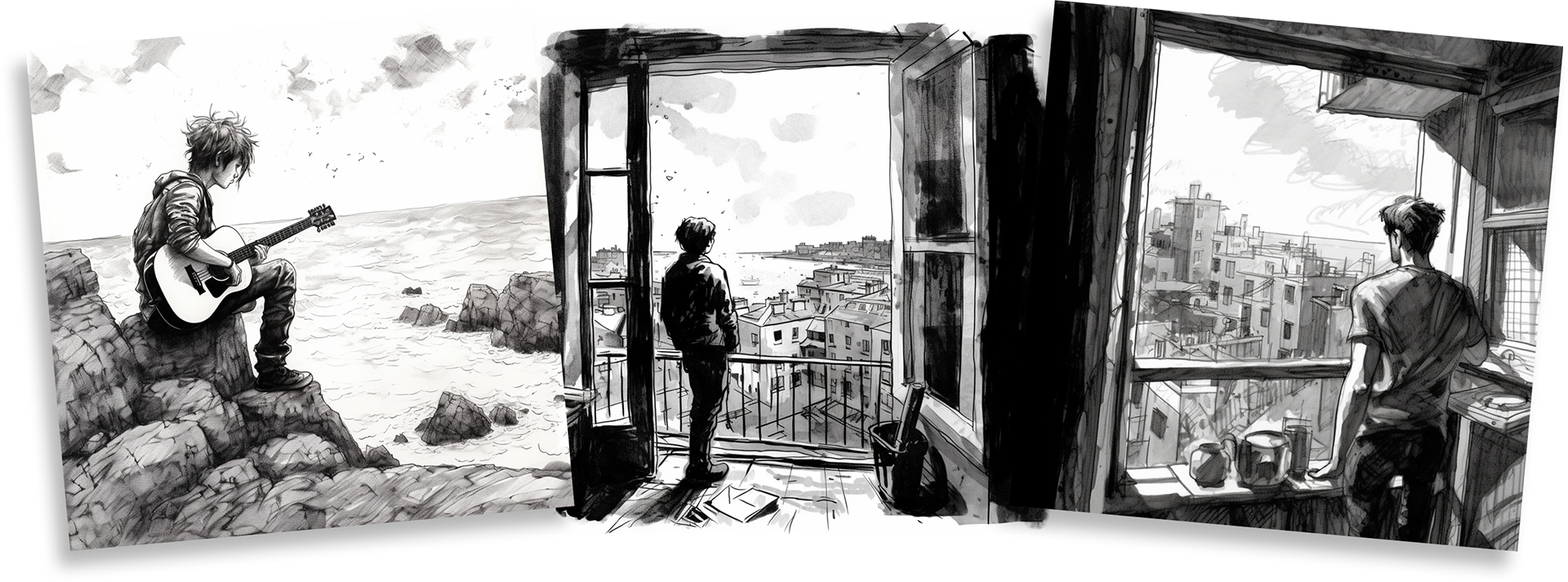 This is the first project where I used MidJourney, the AI tool at the concept stage. I wanted a black and white shot of a teenage boy looking out to the sea in longing for something better. What MJ threw up with my prompts provided a solid conceptual starting point.