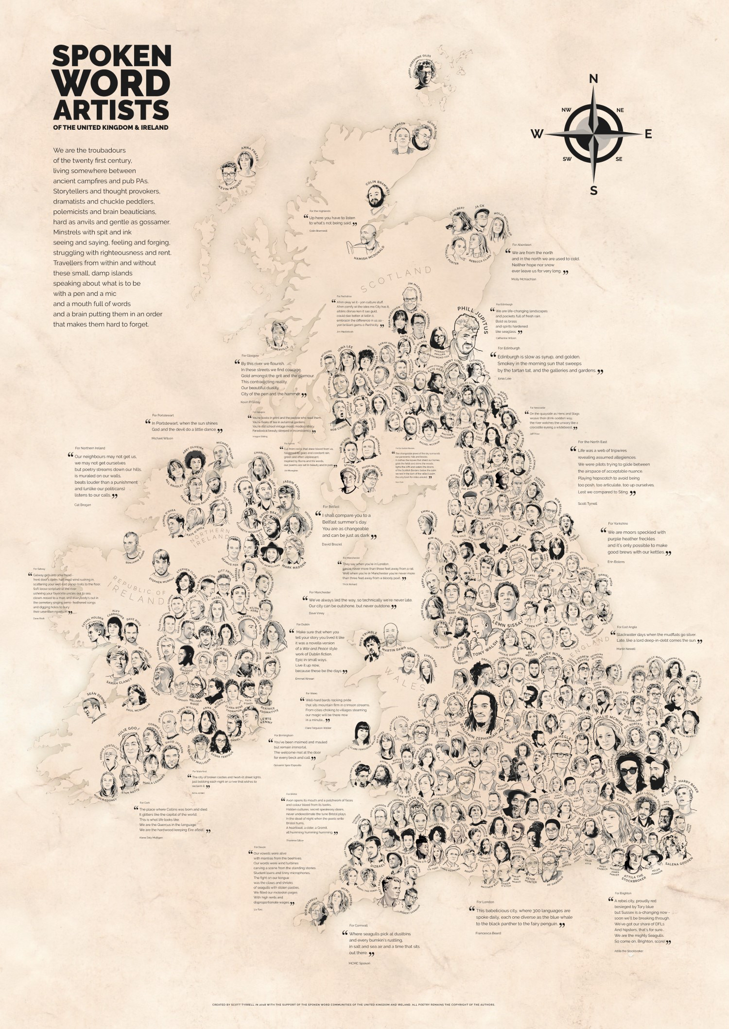 This was a vanity project produced in my spare time over a number of months. As a spoken word artist in my spare time I'd wanted to create a map of our emerging artform and the players who have shaped it. After I put out a call on social media asking for poets' permission to be included in it, It soon became a behemoth of an administration exercise as every poet and their dog wanted to be on it. But I eventually settled on a manageable number of 333 poets.