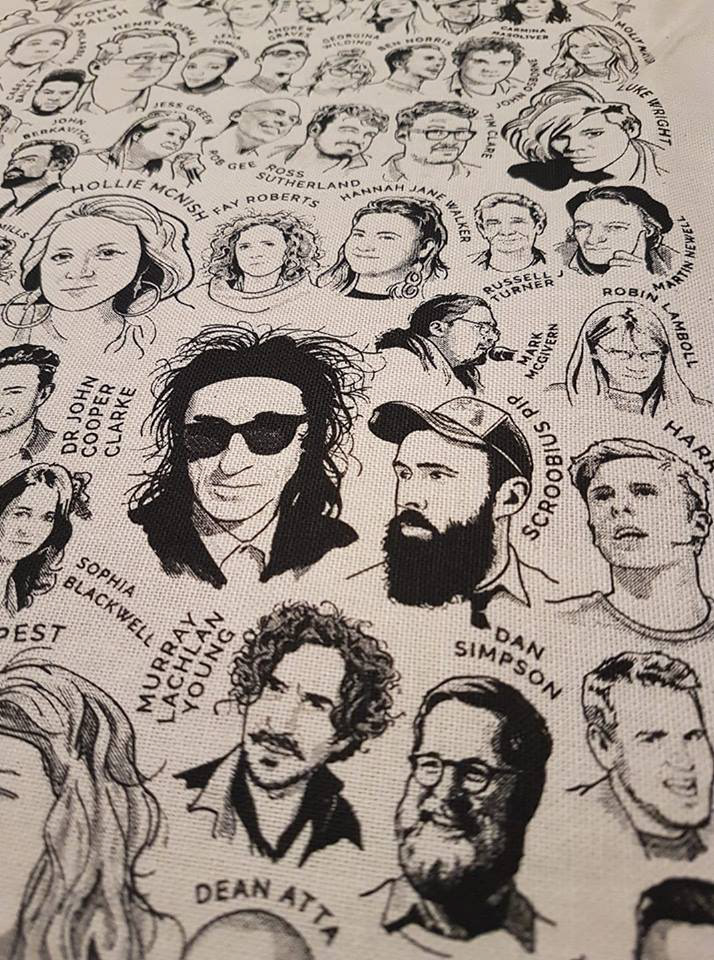 "With the egotistical world of performance poetry I wouldn't believe so many big heads would fit on a king size quilt cover, never mind a tea towel. But the multi talented Mr Tyrrell some how managed it without sacrificing the detail of his trademark uncanny portraits. A thorough and absorbent piece of work"