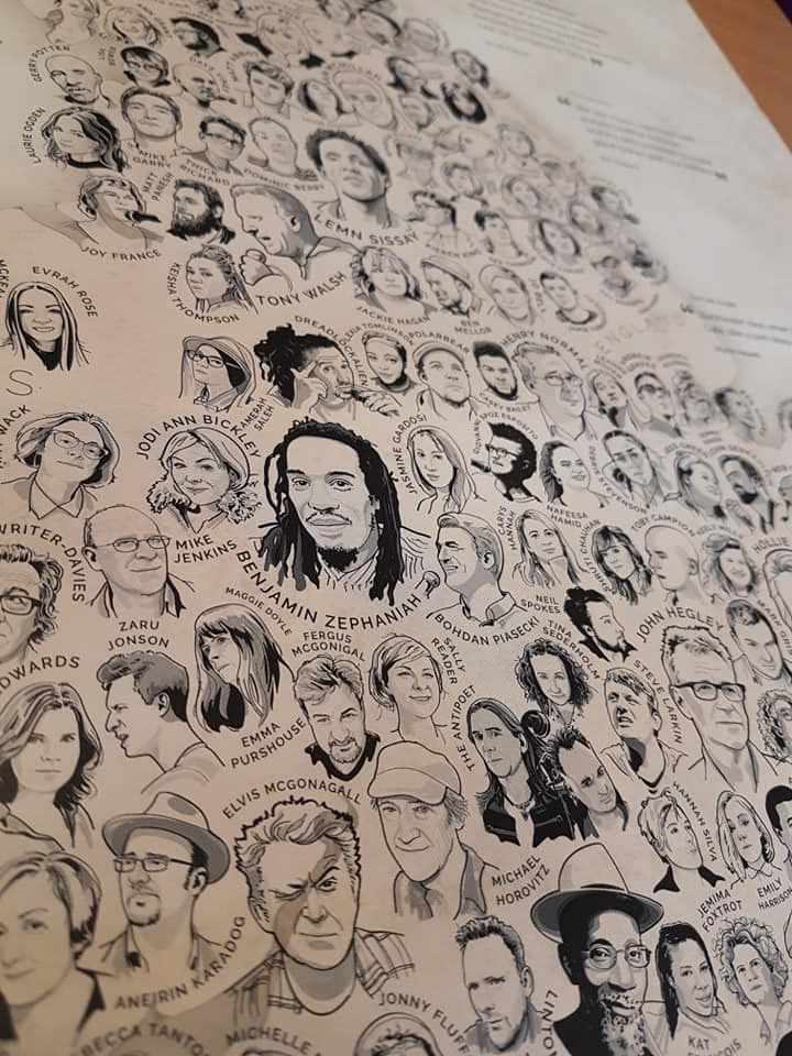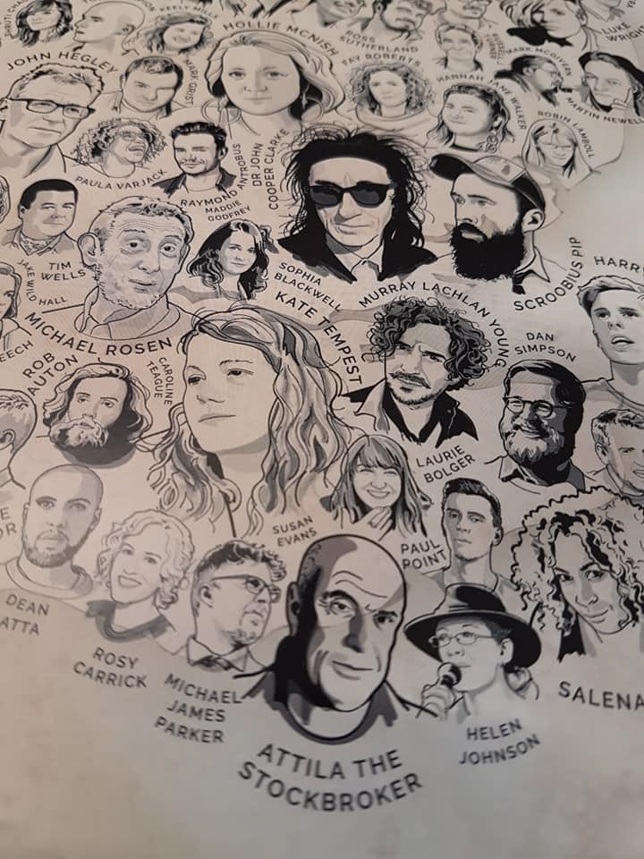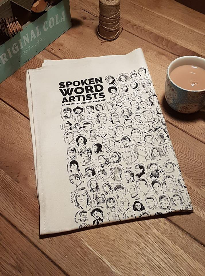 "I’m the proud owner of both the poster map and tea towel. The map focuses my attention when I’m trying to write a poem. You can almost hear the sighs and tuts coming down from the galaxy of talent that surrounds my contented mug in amongst them all. The tea towel has become the go to cloth for cleaning my glass after a whisky or two. There is something comforting in using Benjamin Zephaniah for such a ritual in the hope some of his abundant talent is left on the glass for the next dram"
