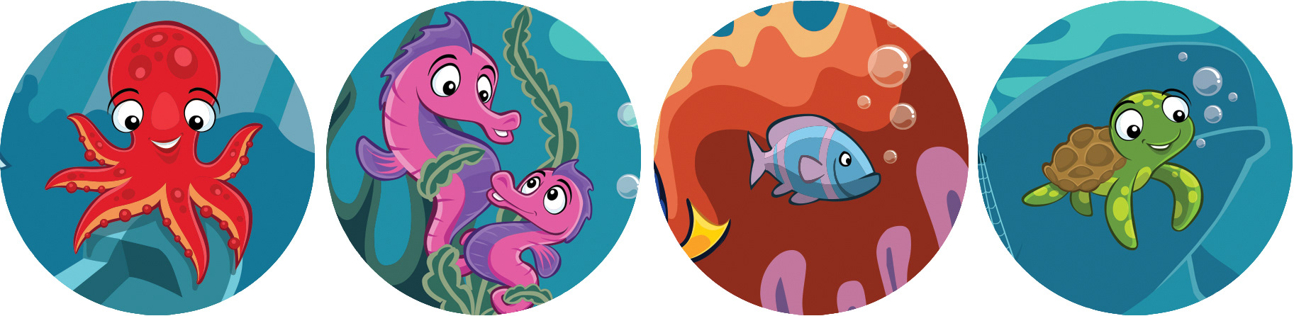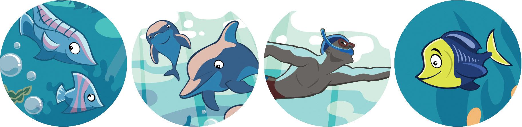 Swim City already had pre-existing sea creature characters representing the various coaching levels. I was asked to bring them up-to-date and add new characters in the form of parent and child seahorses.