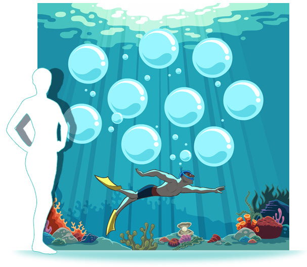 The main bulk of the project was taken up designing an 8 metre mural featuring our sea creatures and coaches in an expansive underwater scene. As this was to be handed to a mural artist to paint, all artwork was produced in flat colour - no gradients or blending - to make it easier for the artist to match.