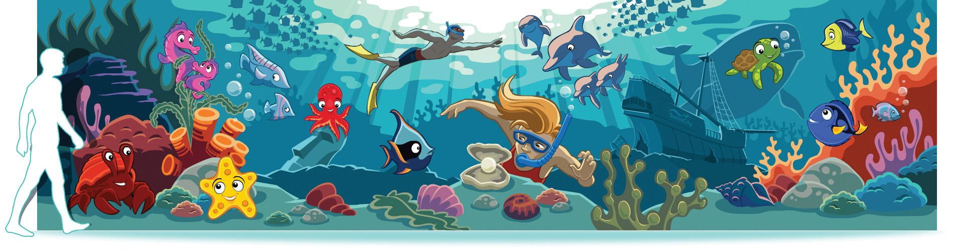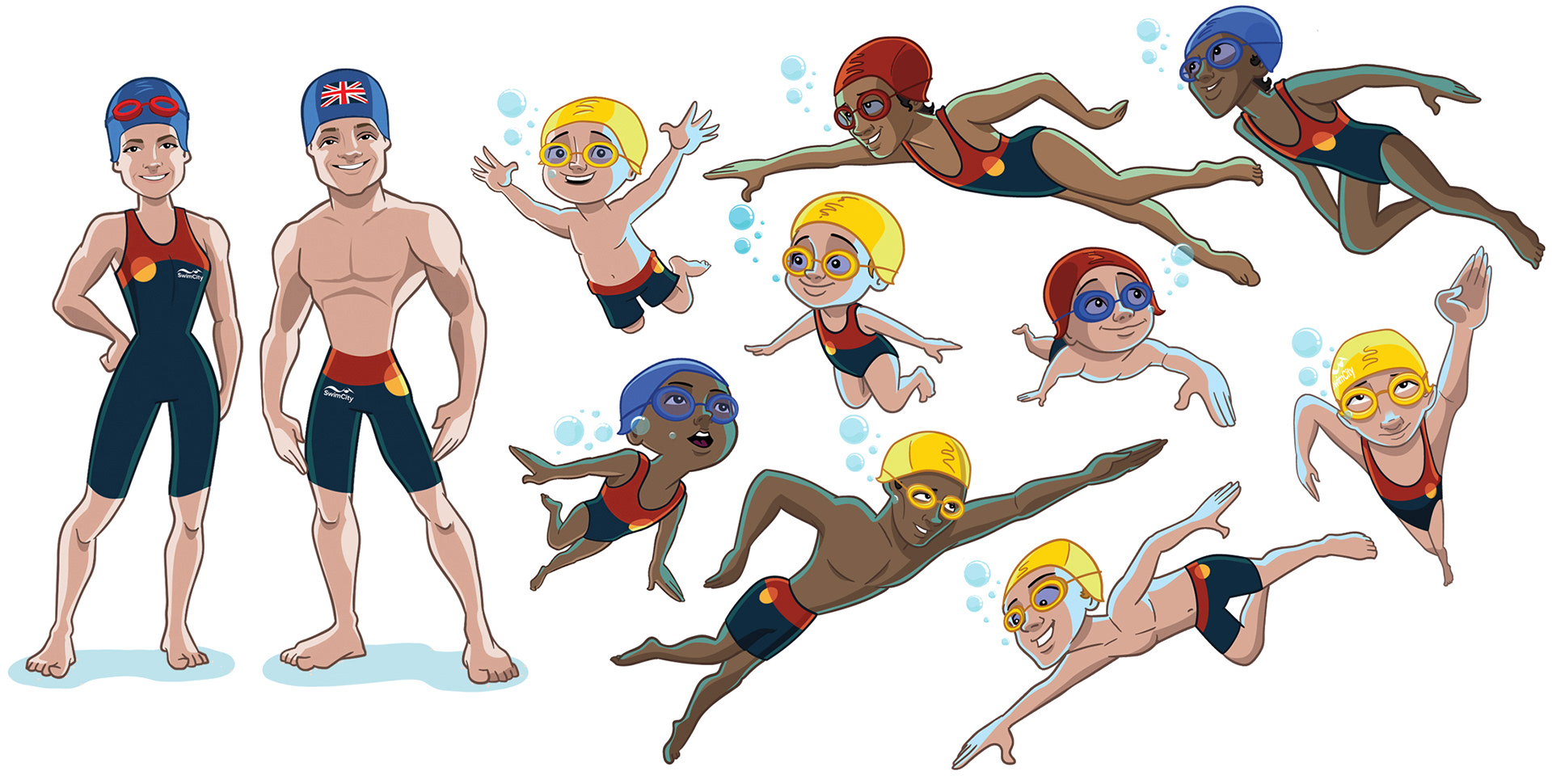Swim City and graphic designer, Kaara Forster approached me to design characters and wall art for the rebranding of the Swim City swimming school.